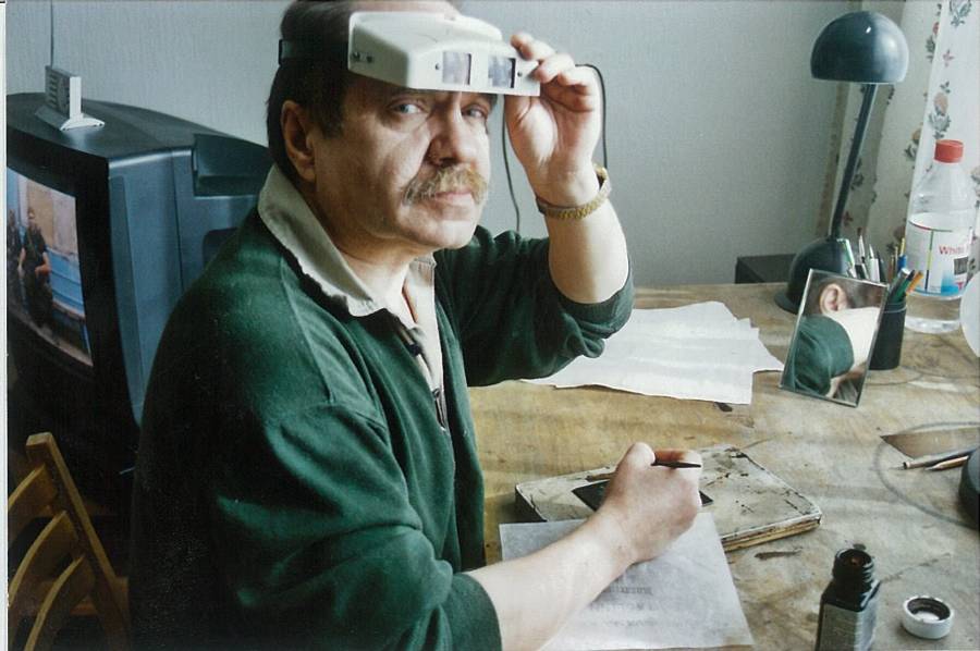 Первое, что бросается в глаза в рабочей комнате Владислава Станишевского, - странный агрегат: громадное колесо, несколько шестерен... Это печатный станок. На столе доска, покрытая черным лаком, тюбики, бутылка с растворителем, несколько готовых работ... Еще один рабочий стол Владислава – старый, но надежный – в другой комнате. На нем - пара микроскопов, штихель (острейший резец).