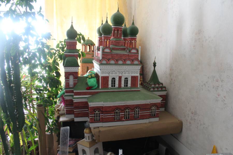 Тут же основной материал – стопка толстых картонных листов. А как делаются купола? Не согнешь ведь такой лист. Оказывается, в основе купола – чашка бюстгальтера. Она окунается в клей и т. д. А маленькие купола-луковки? Тут выручают елочные игрушки, резиновые груши...