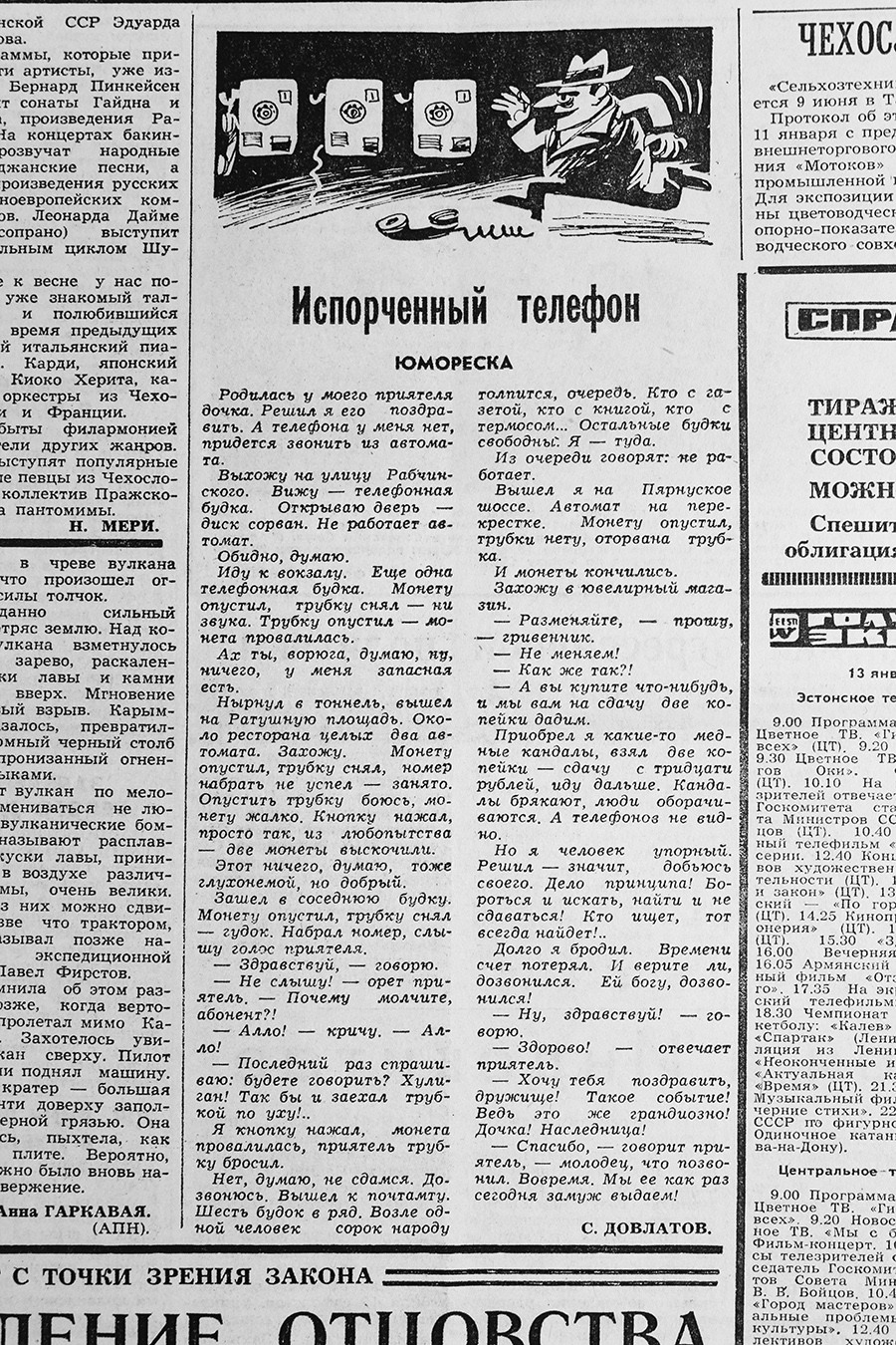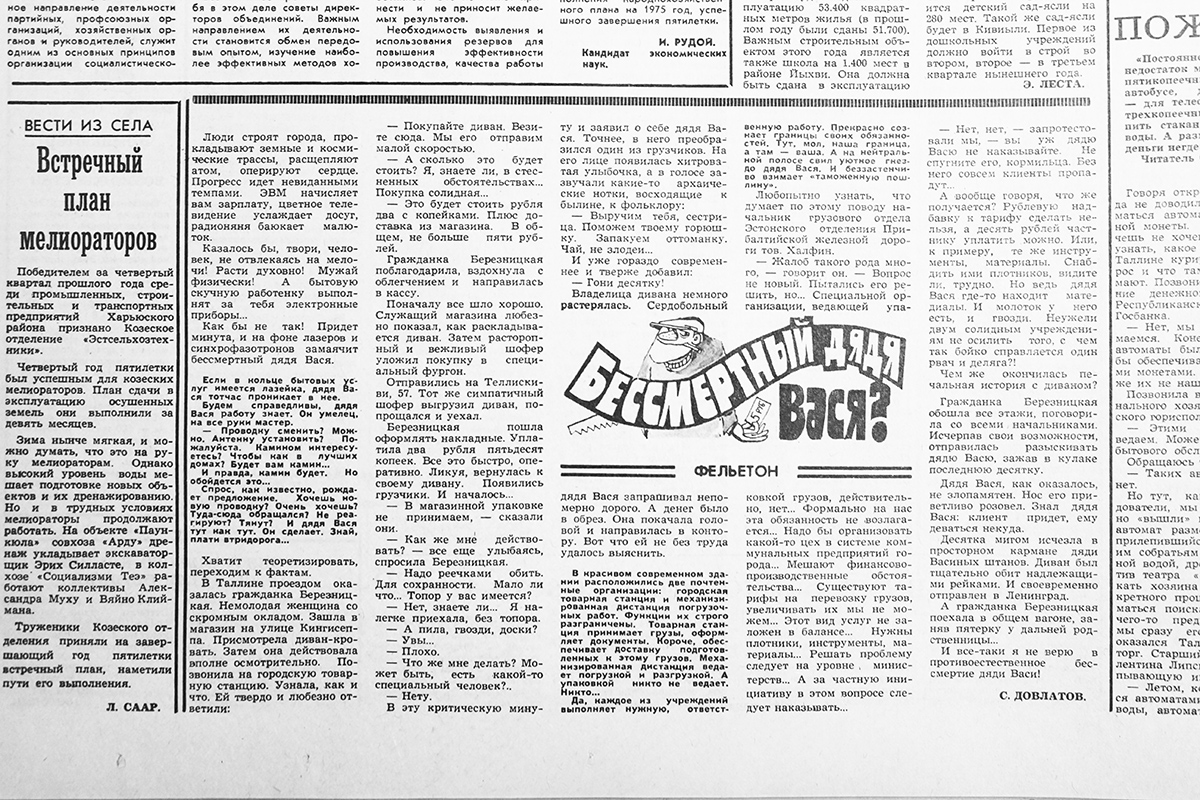 Впрочем, была у Довлатова и пара критических заметок. Но и они написаны с улыбкой. Особенно первая – маленькая юмореска «Испорченный телефон». О том, что на улицах Таллинна сплошь и рядом не работают телефоны-автоматы, невозможно позвонить. Вторая – фельетон «Бессмертный дядя Вася». О том, как грузчики товарной станции вымогают у граждан взятки за свои услуги. Кстати, этот фельетон, в номере за 11 февраля 1975 года, стал последней публикацией Довлатова в «Советской Эстонии».