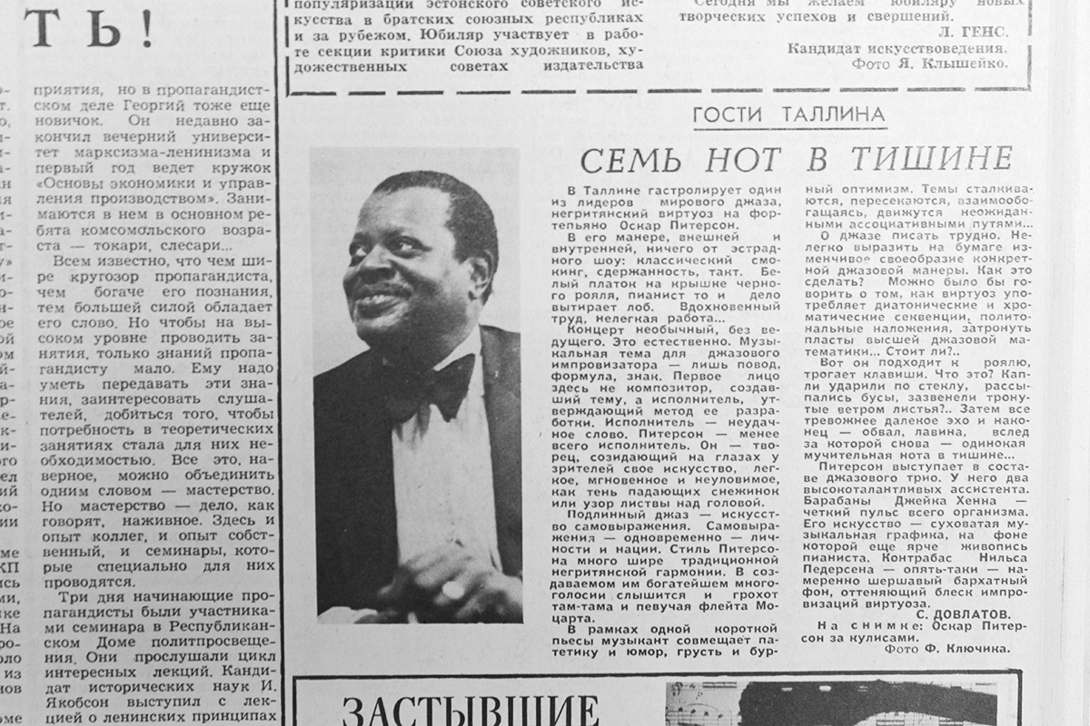 В ноябре 1974 года на гастроли в СССР приехал всемирно знаменитый канадский джазовый пианист Оскар Питерсон со своим трио. Гастроли должны были начаться в Таллинне. Собственно, и начались. Но прибыв затем в Москву, Питерсон обвинил местных организаторов концерта в несоблюдении контрактных обязательств, и музыканты со скандалом отбыли восвояси. Таким образом, выступление знаменитости в Таллинне, в зале «Эстония», оказалось единственным в СССР. Ажиотаж, говорят, был страшный, но Довлатов, любивший и понимавший джаз, сумел, как он пишет, попасть на концерт.