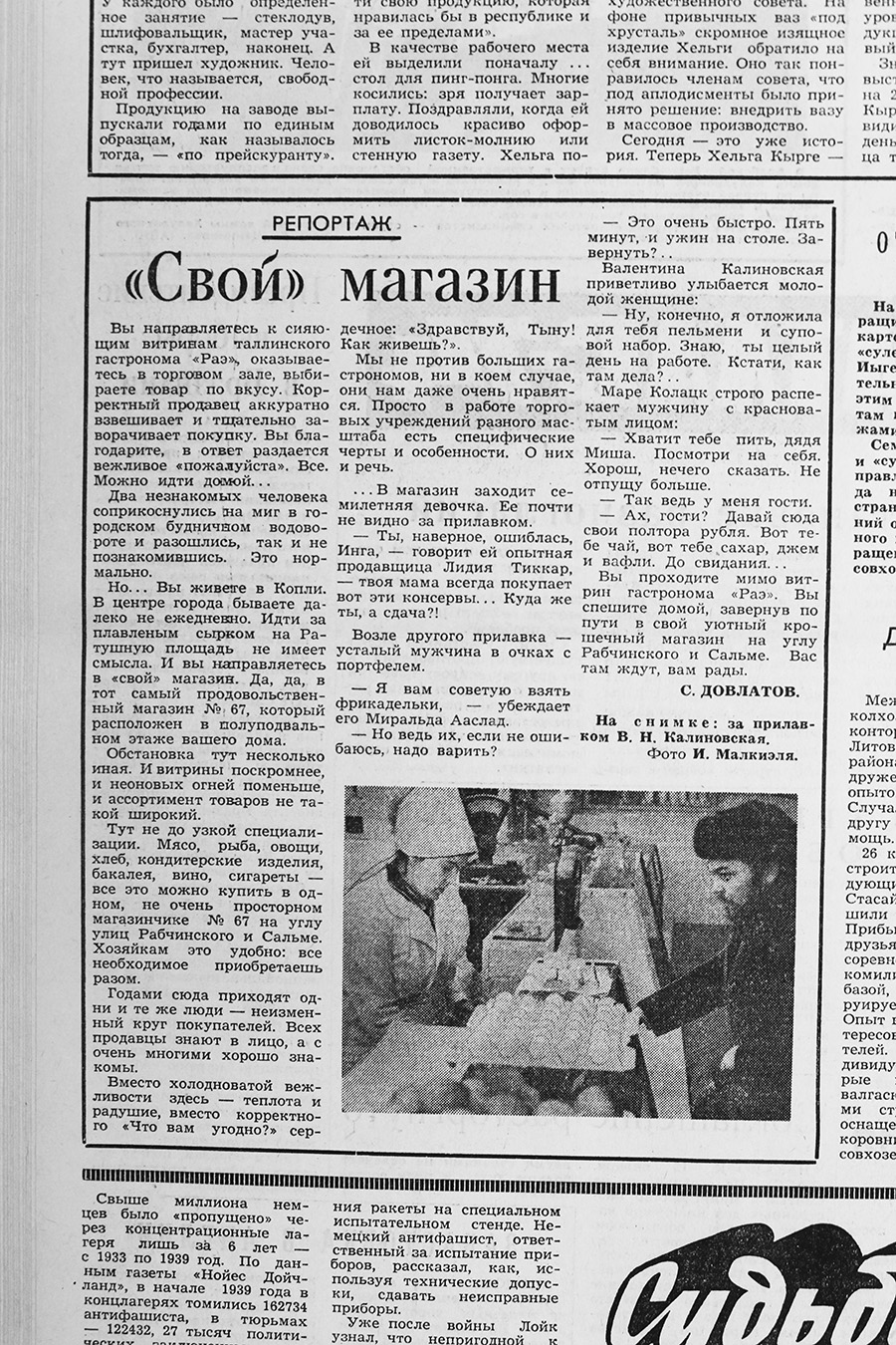 О последнем чуть подробнее. Журналист С. Довлатов считает, что нецелесообразно ехать за плавленым сырком, скажем, из Копли в гастроном «Раэ» на Ратушной площади, хотя неоновый свет, которым светятся его витрины, и радует глаз. Для таких покупок у каждого из нас должен быть «свой» магазин, поблизости от дома, рассуждает он. У него такой есть, и теперь мы знаем, где Довлатов покупал плавленые сырки – в магазине № 67, что на углу Рабчинского (Вабрику) и Сальме. То есть даже не поблизости, а прямо в доме, где жил. Отличный магазин, судя по его репортажу о том, как душевно здесь обслуживают покупателей продавщицы Лидия Тиккар, Миральда Ааслад и Валентина Калиновская.